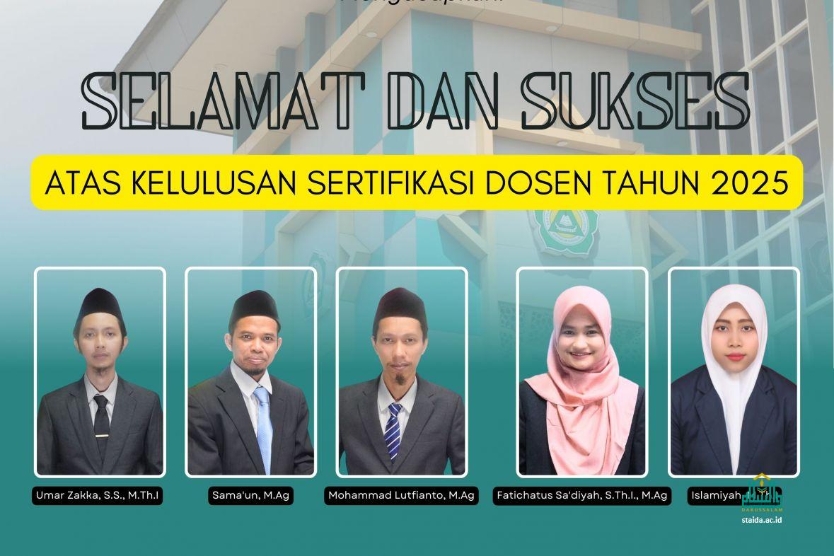 Lima dosen yang juga menjabat dalam struktur pimpinan STAIDA dinyatakan lulus Sertifikasi Dosen tahun 2025. Mereka adalah KH. Umar Zakka, S.S., M.Th.I. (Ketua STAIDA); Sama’un, M.Ag. (Wakil Ketua III STAIDA); Mohammad Lutfianto, M.Ag. (Ketua Lembaga Penelitian dan Pengabdian Masyarakat STAIDA); Fatichatus Sa’diyah, S.Th.I., M.Ag. (Ketua Program Studi Ilmu Hadis STAIDA); dan Islamiyah, M.Th.I. (Dosen Program Studi Ilmu Al-Qur'an dan Tafsir STAIDA).
