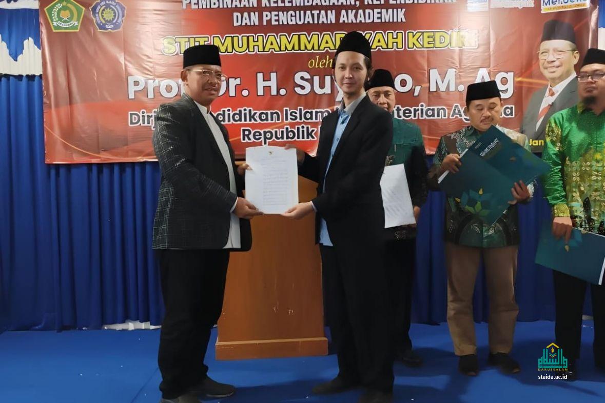 Penyerahan SK tersebut dilaksanakan dalam rangkaian acara "Pembinaan Kelembagaan, Kependidikan, dan Penguatan Akademik" yang dipusatkan di Aula Kampus STIT Muhammadiyah Kediri selaku tuan rumah.